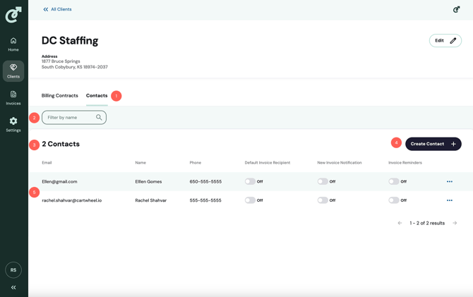 Contacts can be found on the client detail page. Navigate to the client details page by going to the list of clients and clicking on a client in the list. By default you will land on the “Billing Contracts” tab. To view and manage contacts, click on the “Contacts” tab. Below is a detailed description of the “Contacts” tab.