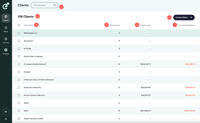 You can navigate to the client list by clicking the “Clients” tab in the navigation. From here, you can create new clients and view all the existing clients in your system. Clicking on any row in the client list will take you to the client details page. See below for a detailed description of the client list.