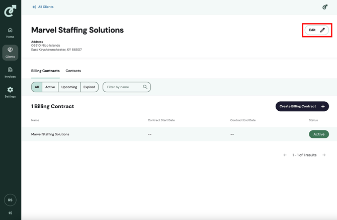 To edit a client, first navigate to the client detail page by going to the list of clients and clicking on the client you want to edit from the list. You will land on the client details page. From here, click on the “Edit” button in the top-right corner.