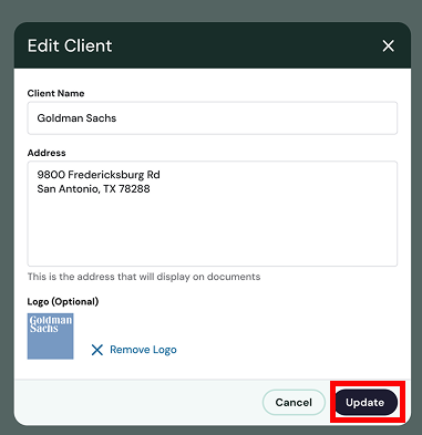 After you click the “Edit” button the “Edit Client” popup will open where you can modify the client name, address and logo. Once you have modified the relevant information, click the “Update” button in the popup.