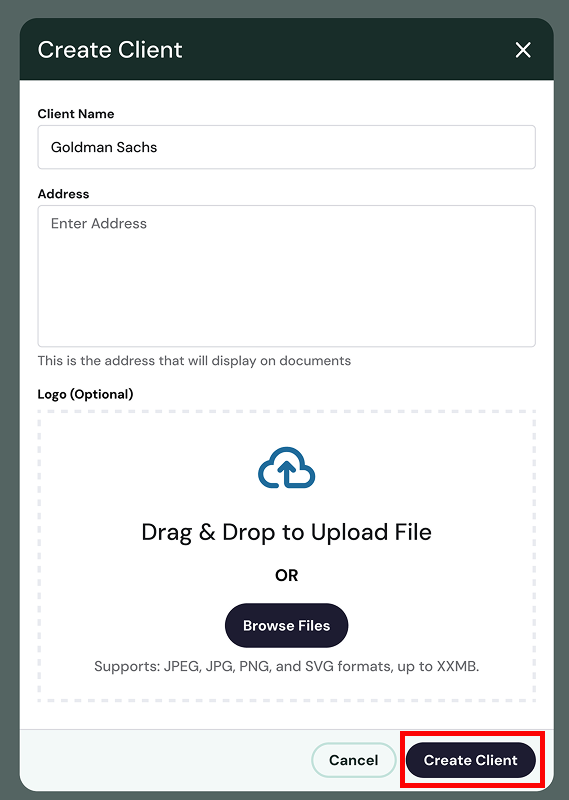 After you click the “Create Client” button, the “Create Client” popup will open where you can define the client name, address, and logo. Once you have filled out the relevant information, click the “Create Client” button in the popup.