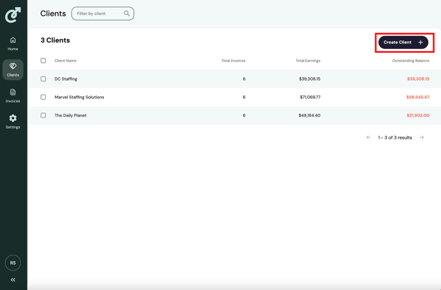 To create a new client, first navigate to the list of clients by clicking the “Clients” tab in the navigation bar. Once on the client list, click on the “Create Client” button in the top-right corner.