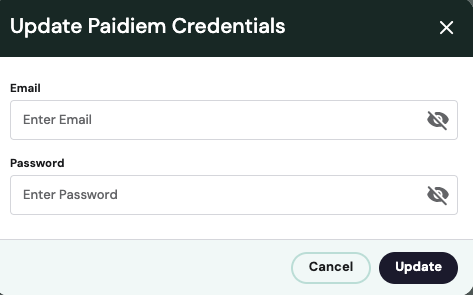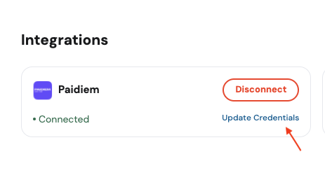 - Click the ‘Update Credentials’ button inside the your providers display card (e.g. Paidiem).
