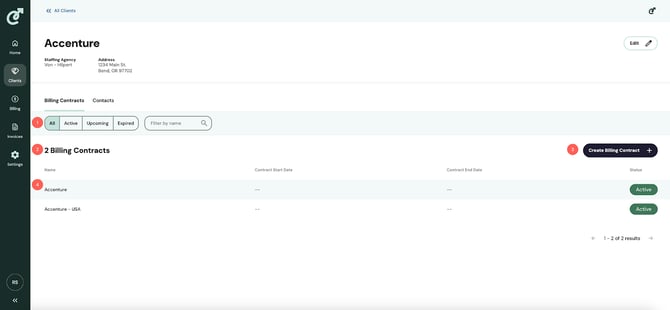 Billing contracts can be found on the client detail page. Navigate to the client details page by going to the list of clients and clicking on a client in the list. By default, you will land on the “Billing Contracts” tab. Below is a detailed description of the “Billing Contracts” tab.