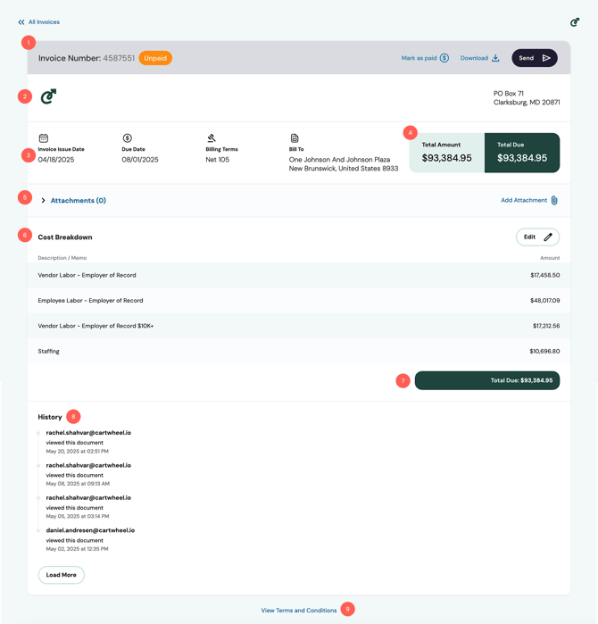 Invoices in Cartwheel are documents issued by your agency requesting payment for goods or services provided. It outlines the transaction details, including itemized costs, total amount due, and payment terms. See below for a detailed description of each element of the invoice page in Cartwheel.