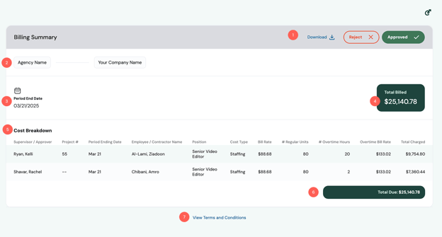 In the top-right, you will find all your available actions. Click “Download” to download a PDF version of the Billing Summary. You can also approve or reject the billing summary by clicking “Approve” or “Reject.” For more information on approvals and rejections, see the How do I approve or reject a billing summary? FAQ.