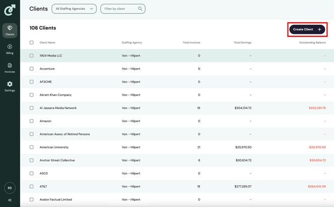 To create a new client, first navigate to the list of clients by clicking the “Clients” tab in the navigation bar. Once on the client list, click on the “Create Client” button in the top-right corner.
