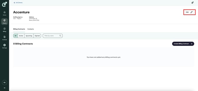 To edit a client, first navigate to the client detail page by going to the list of clients and clicking on the client you want to edit from the list. You will land on the client details page. From here, click on the “Edit” button in the top-right corner.