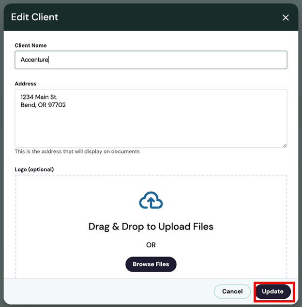 After you click the “Edit” button the “Edit Client” popup will open where you can modify the client name, address and logo. Once you have modified the relevant information, click the “Update” button in the popup.