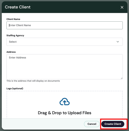 After you click the “Create Client” button the “Create Client” popup will open where you can define the client name, address and logo. Once you have filled out the relevant information, click the “Create Client” button in the popup.
